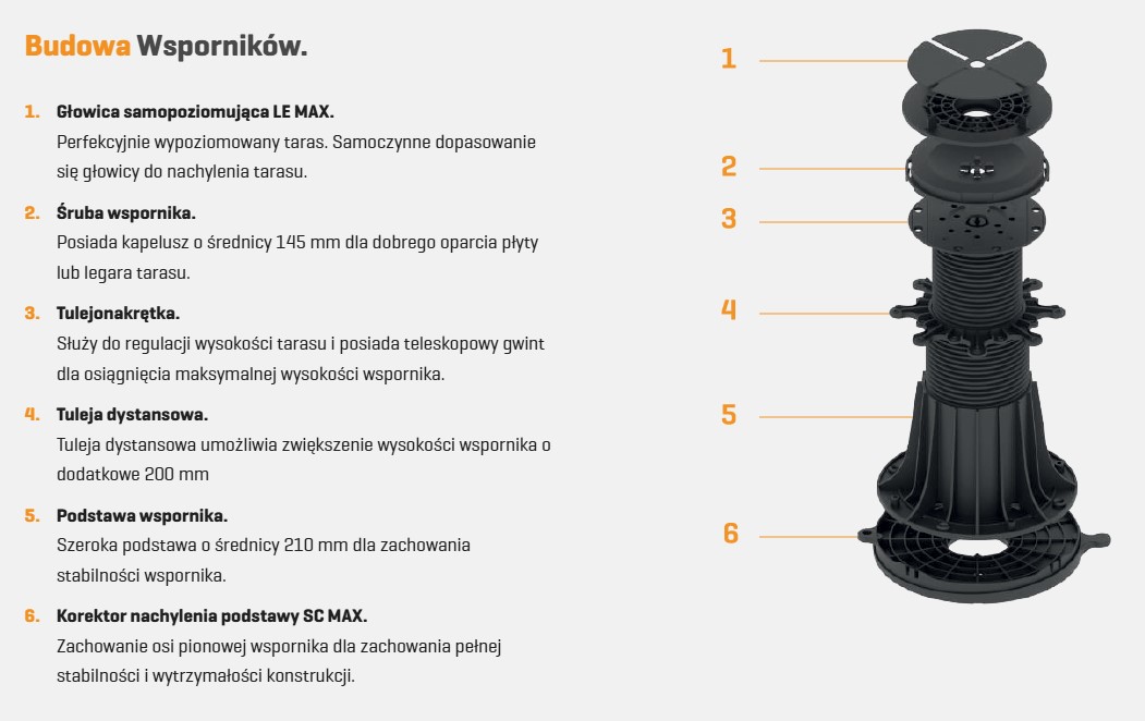 Bez problemu podniesiesz taras nawet do 95 cm z zachowaniem jego stabilności. Dodatkowym wyposażeniem uzupełnisz funkcjonalność wspornika.