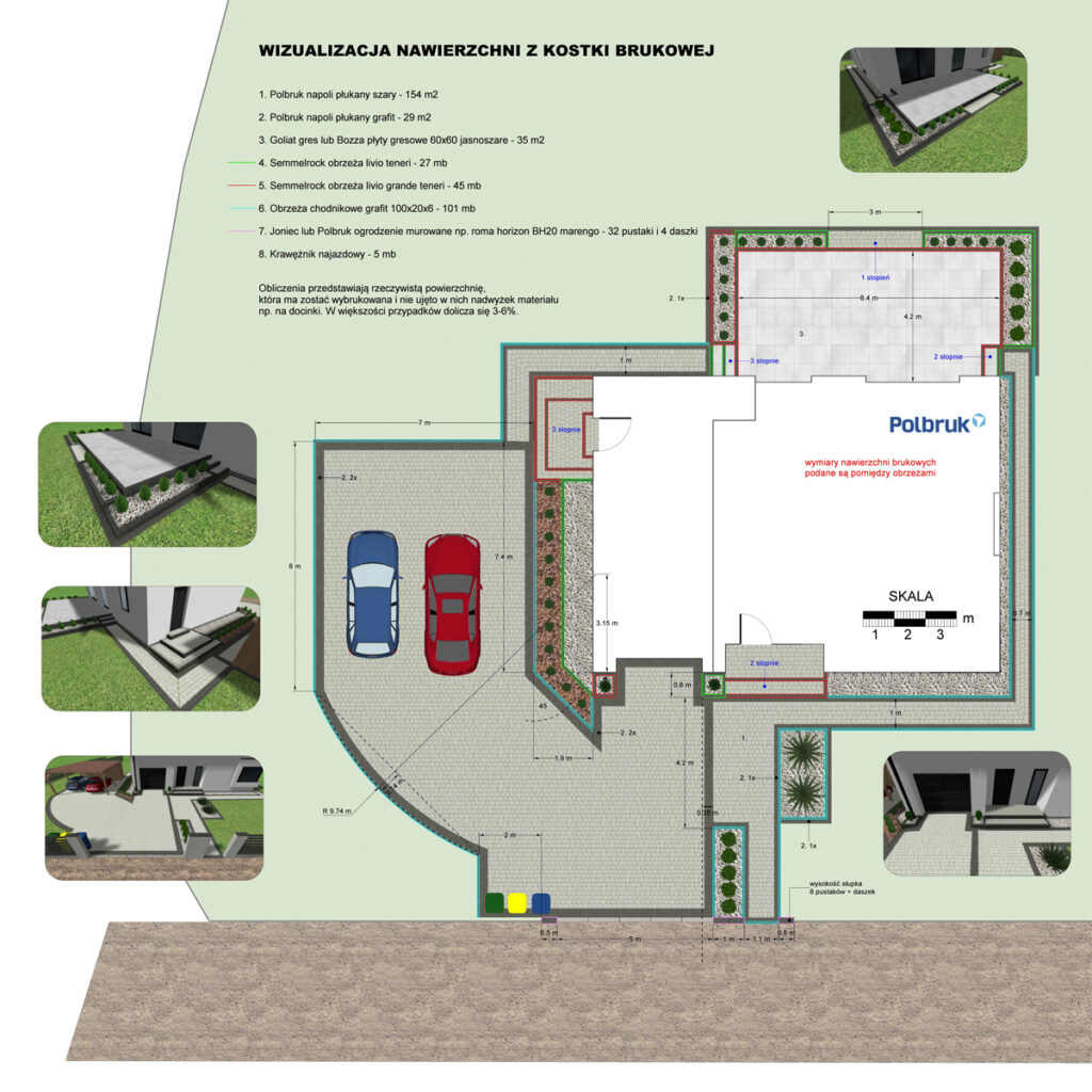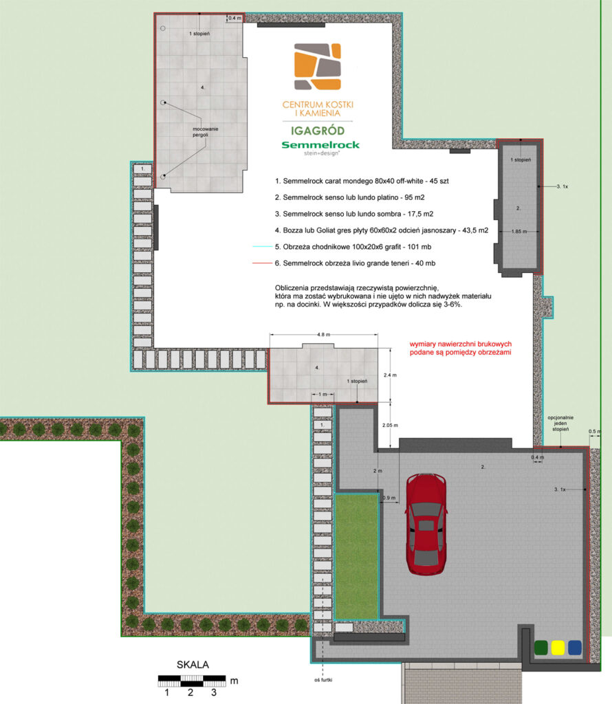 Wykonywany projekt oparty jest na produktach: – Polbruk – Semmelrock – Bruk Czyżowice – Ceramika Goliat, Garden Stones – Ogrodzenia Joniec, Konekt (dotyczy produktów będących w aktualnej ofercie producenta)